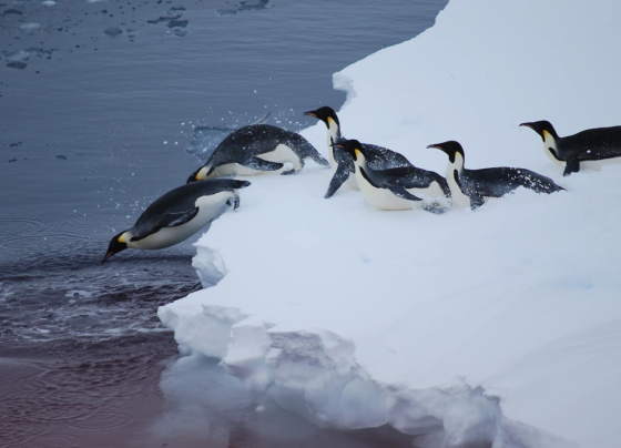 Emperor Penguins entering the water from a flat piece of floating sea ice (floe ice)(Photo: Andrew Burgess) Warta Kema –…