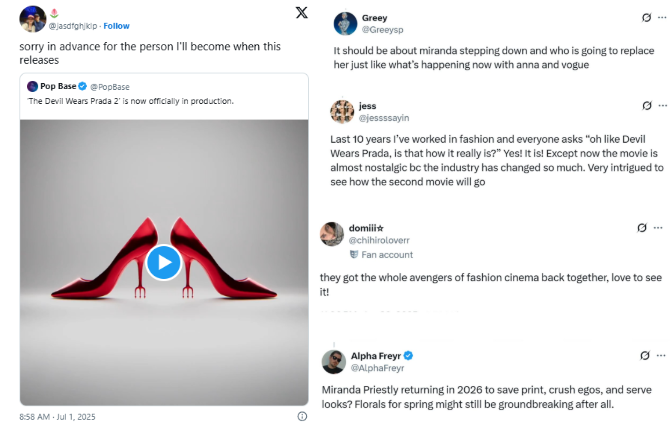 Fan conversations on X about the upcoming The Devil Wears Prada 2 on X