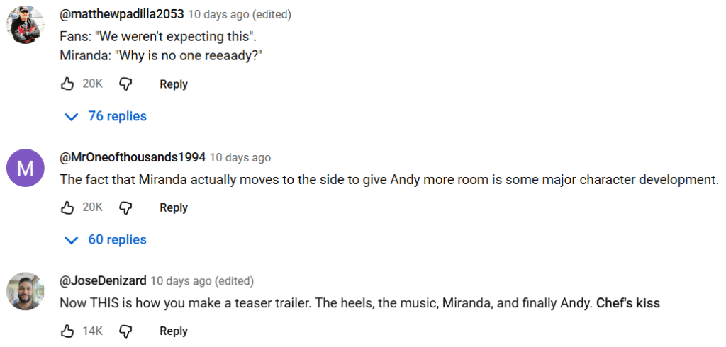 Fan comments from The Devil Wears Prada 2 trailer video on YouTube
